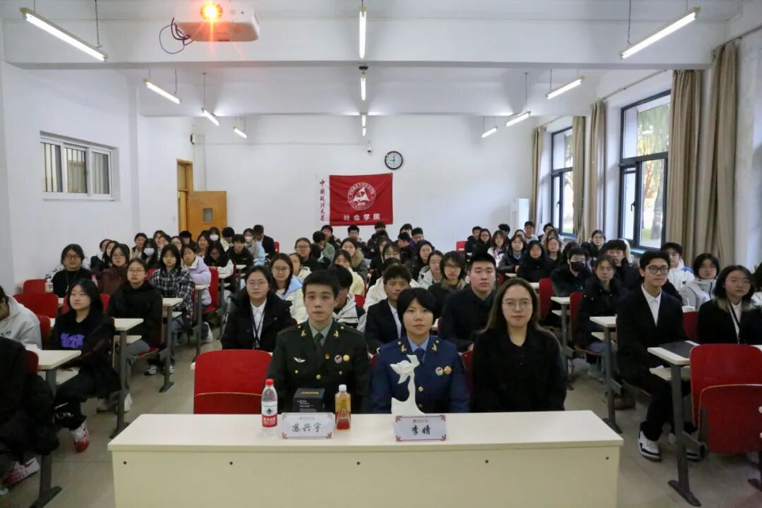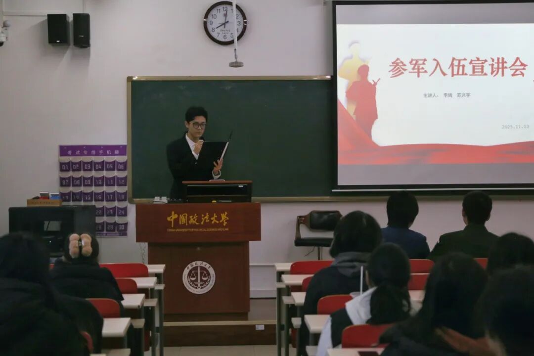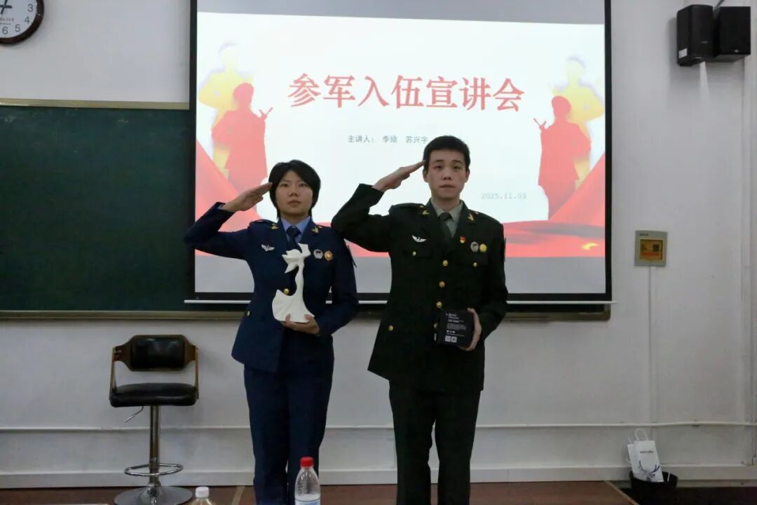 团委主办、学生委员会承办的2025年参军入伍宣讲会在端升楼104教室举行。本次参军入伍宣讲会邀请了两位优秀的退伍同学来为大家进行经验分享和相关政策解读,旨在帮助2025级新生了解征兵条件、入伍流程、学业保障及退役优待政策等相关信息,引导新生厚植家国情怀,鼓励青年学子携笔从戎、献身国防,将个人成长融入强国强军事业,将青春书写在祖国大地上。
